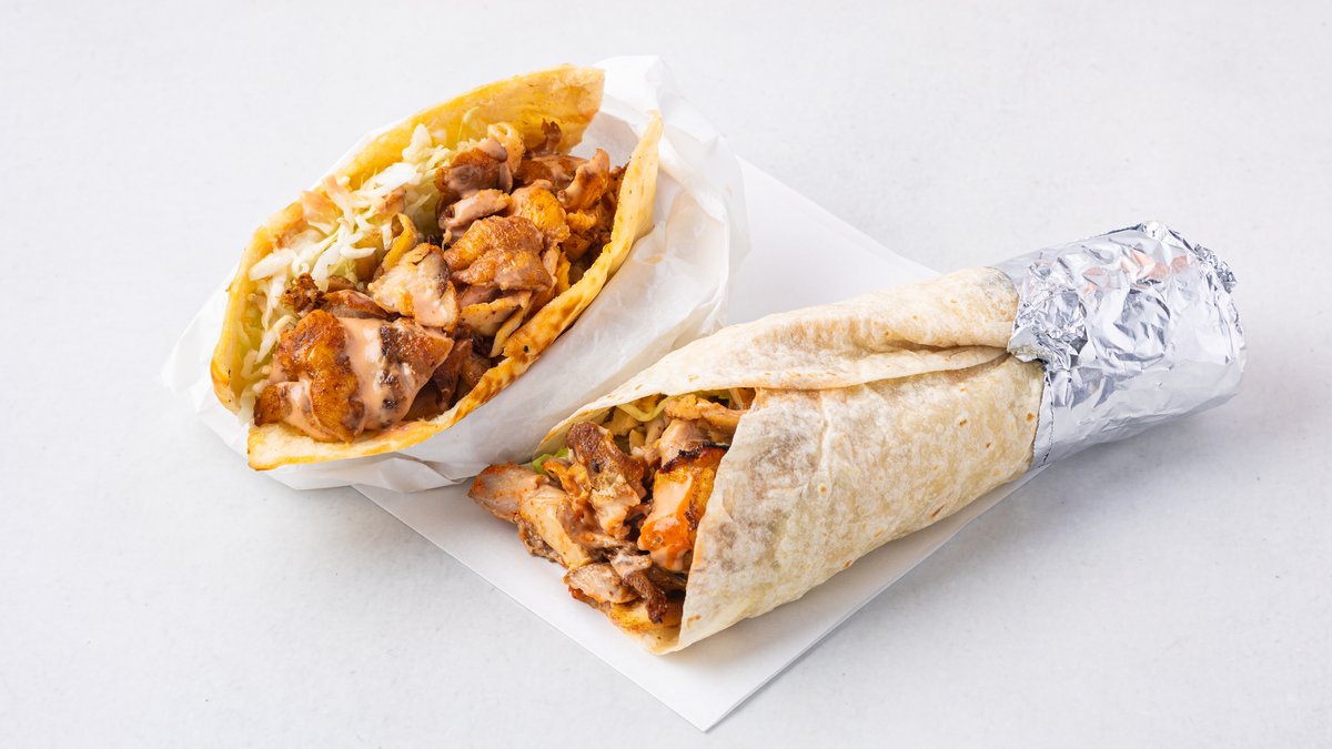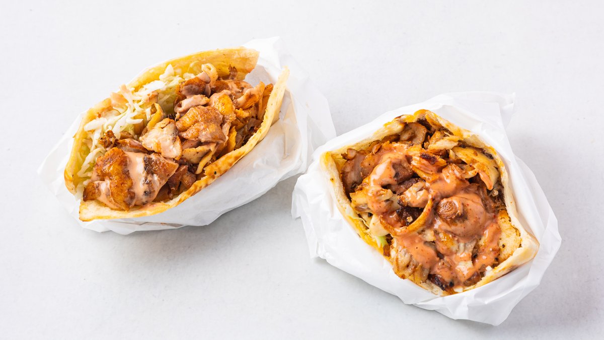 定番のケバブサンドとトルティーヤで巻いたケバブロールのセットです。パンと巻物の食感の違いをお楽しみください。