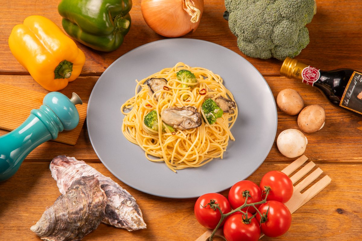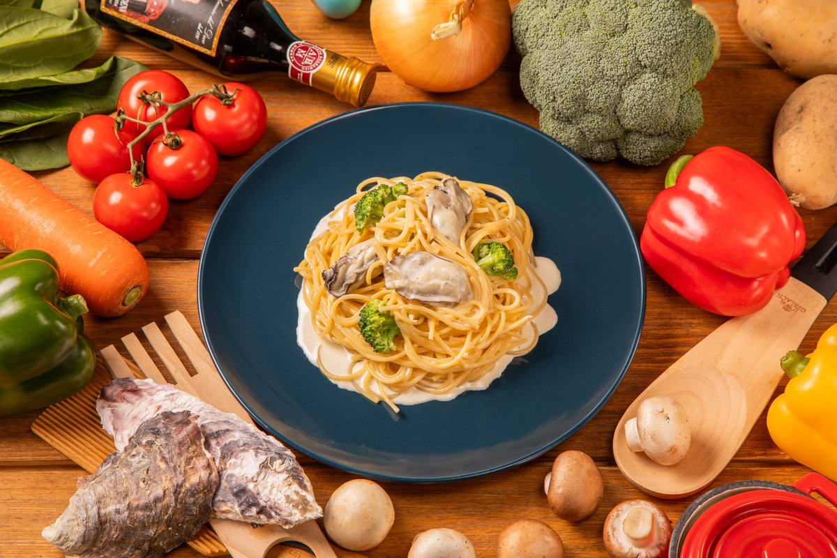 クリーミーなソースと牡蠣の旨味が絡み合う、贅沢なパスタ。ブロッコリーの彩りが食欲をそそります。