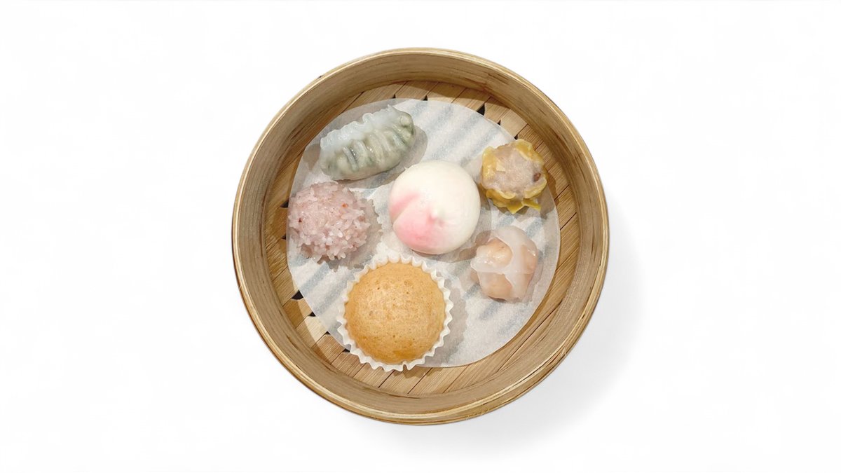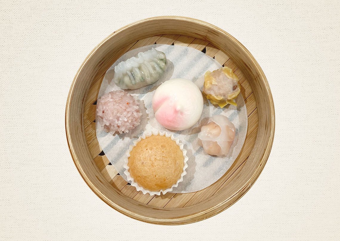 点心六種 香港式シュウマイ (燒売) 海老蒸し餃子 (蝦餃) ひとくち桃まん (小寿桃包) 海老とニラの蒸し餃子 (大蝦韭菜餃) マーラーカオ (馬拉羔) チンツーワンズ (珍珠丸子)