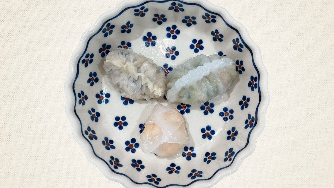 蒸し餃子三種類 海老蒸し餃子 (蝦餃) フカヒレ蒸し餃子 (魚翅餃) 海老とニラの蒸し餃子 (韮菜蒸餃)