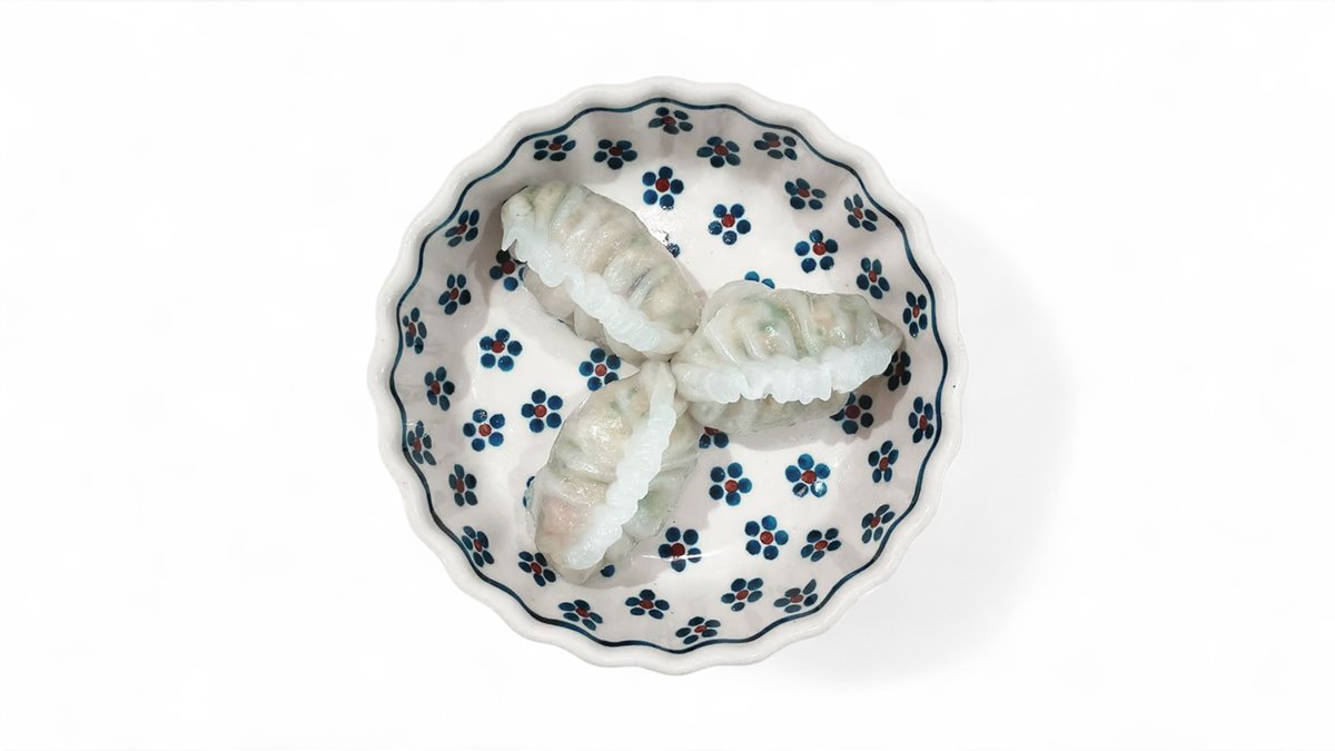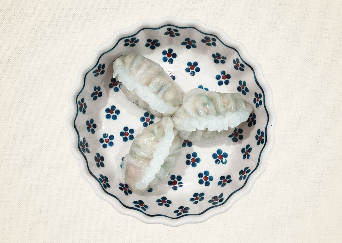 極細に刻んだチンゲン菜と脂身と赤みが均一な豚肉餡を、一緒に透けるように薄くコシのある皮で包みました。