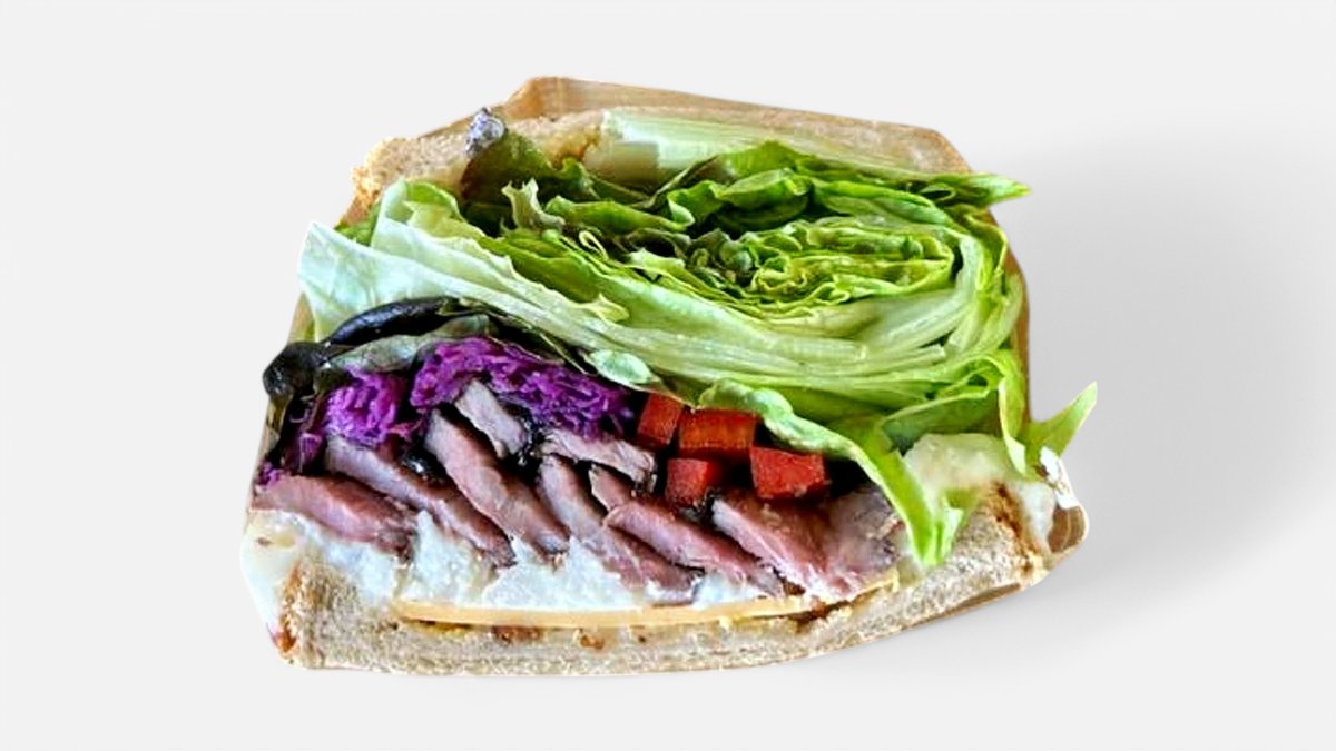 自家製のジューシーなローストビーフに赤ワインハニーソース、パプリカ、紫キャベツのラぺ、レタスたっぷり!※こちらの商品はチーズを含みます