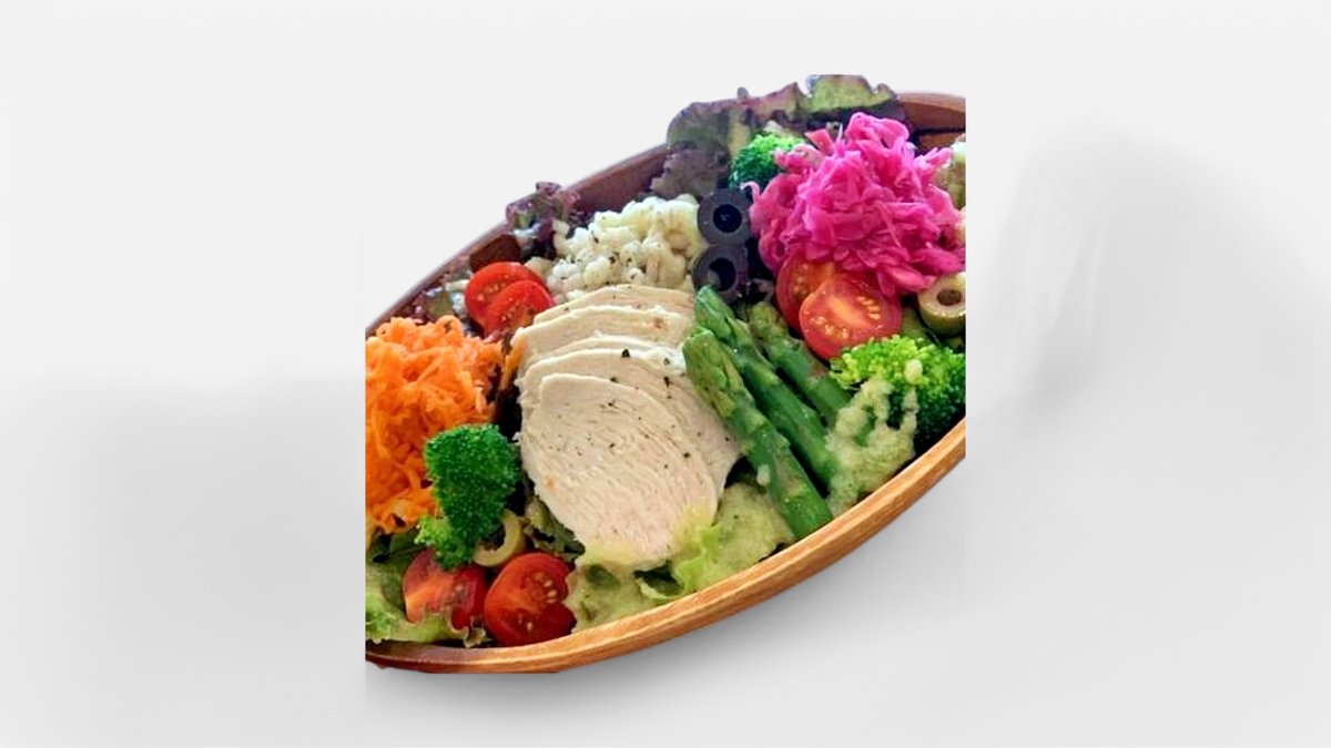 ジューシーな自家製チキンに7種類の野菜が入ったサラダ、と選べるドリンクのセットです。