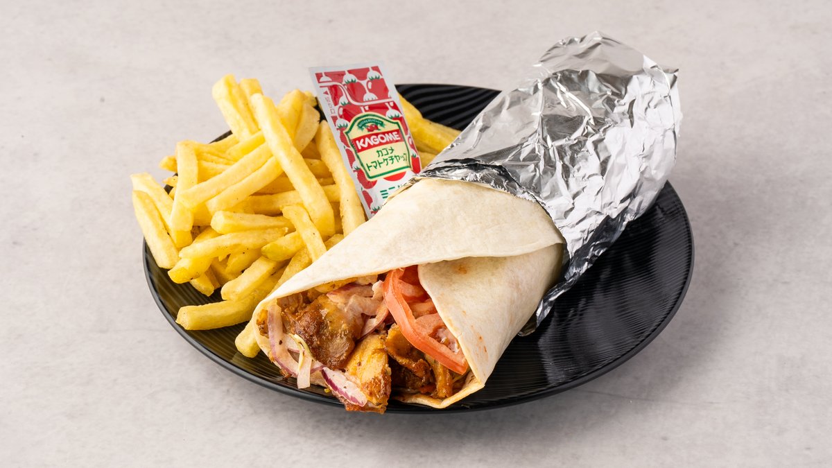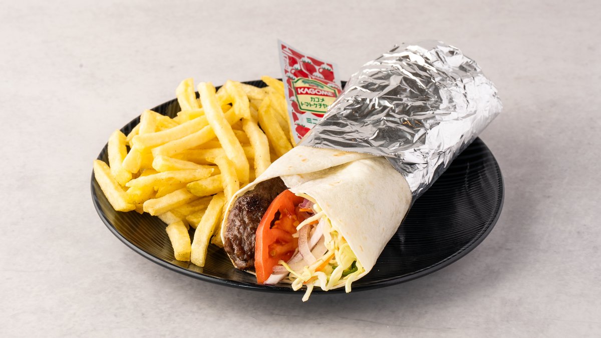 ビーフラップとカリカリポテトの相性抜群なセットです。※写真はチキンラップです。