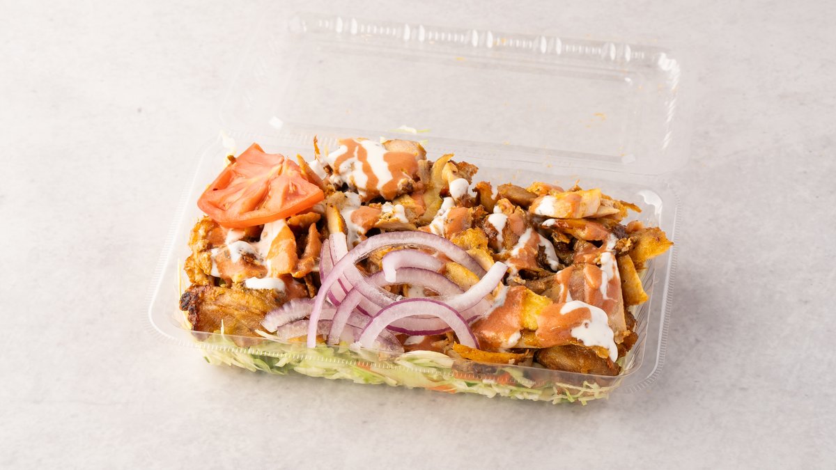 ケバブ肉がたっぷりのせられた丼、香ばしいソースがご飯と絶妙に絡みます。