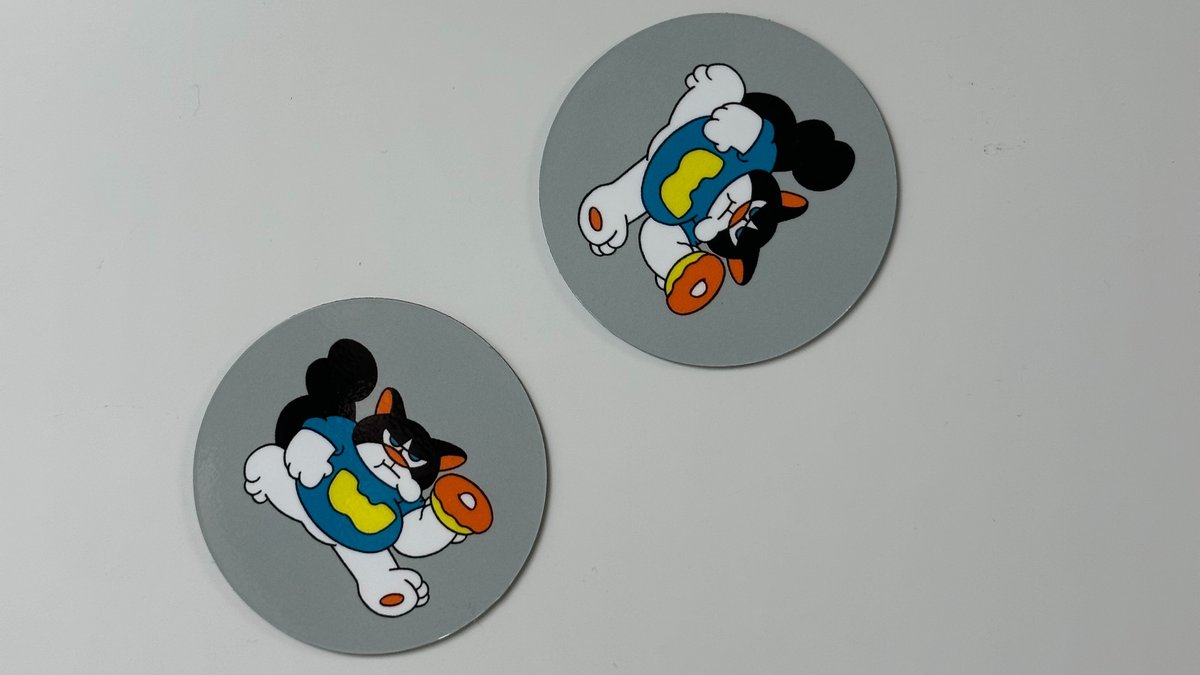 WARU WARU DONUTオリジナルキャラクターのステッカー。リッチな光沢シールになっています。直径6cmで、どこに貼るにもちょうどいいサイズ。