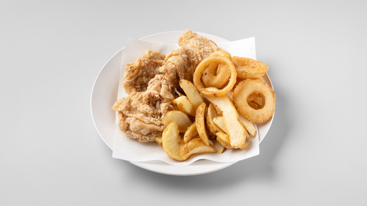 定番の3種を盛り合わせました。【内容】唐揚げ3個、ポテト100g、オニオンポテト50g
