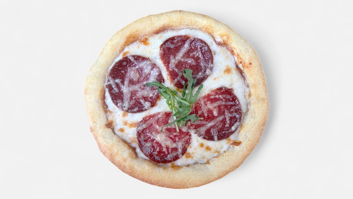 ცომი, პეპერონი ძეხვი, მოცარელა, პარმეზანი, პიცის სოუსი