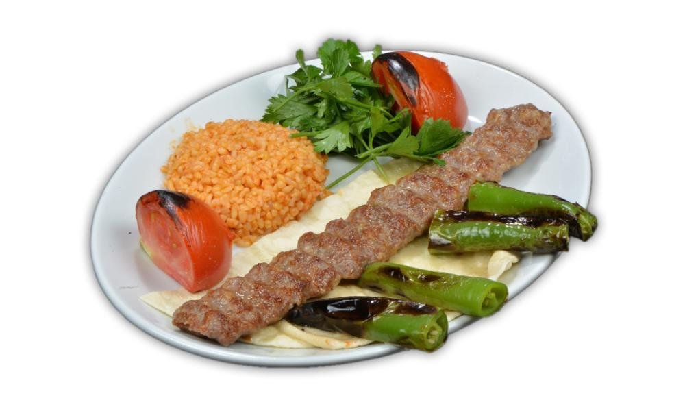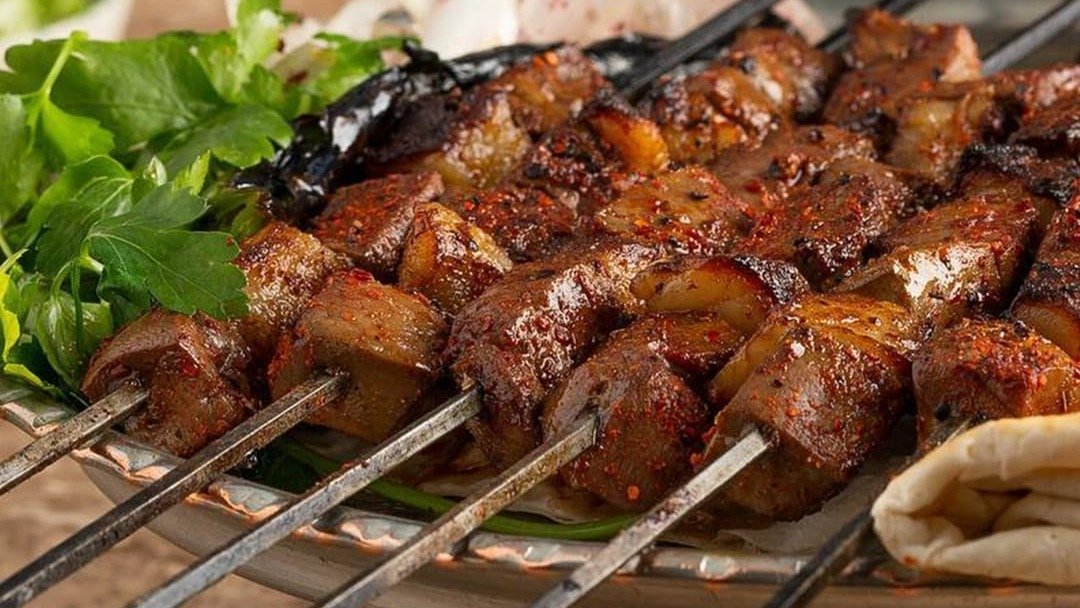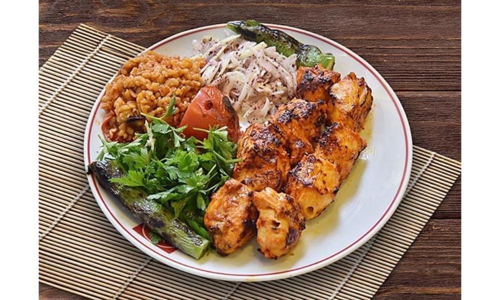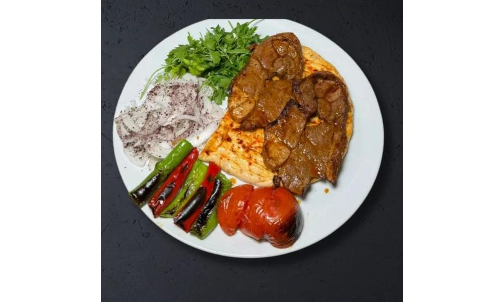საქონლოს ხორცი შემწვარი მაყალზე,მორთმეული ბრინჯით,ბულგალურით,სალათის ფურცელით,ლავაში პურით და გრილზე შემწვარი პომიდვრით და წიწაკით