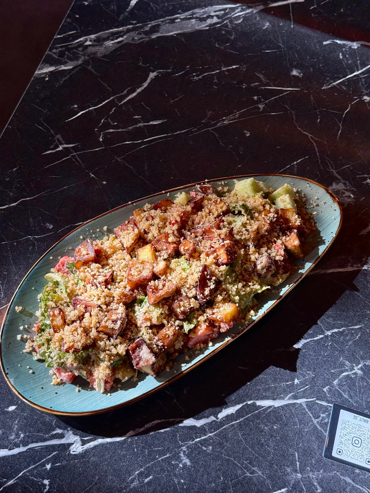 Chicken liver salad with baked pumpkin and arugula with sesame sauce and orange