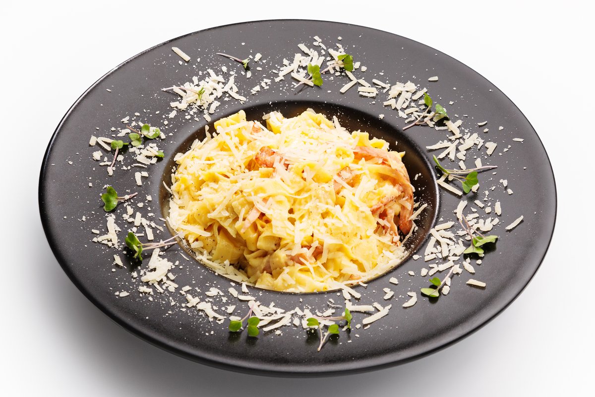 პასტა ტალიატელე, კვერცხი, პარმეზანი, ბეკონი Tagliatelle pasta, egg, Parmesan, bacon