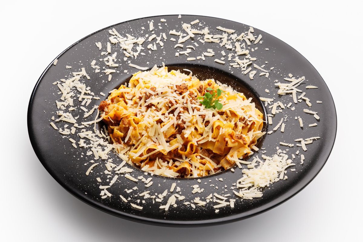 პასტა ტალიატელე, საქონლის ფარში, პომიდვრის სოუსი, პარმეზანი Tagliatelle pasta, ground beef, tomato sauce, Parmesan