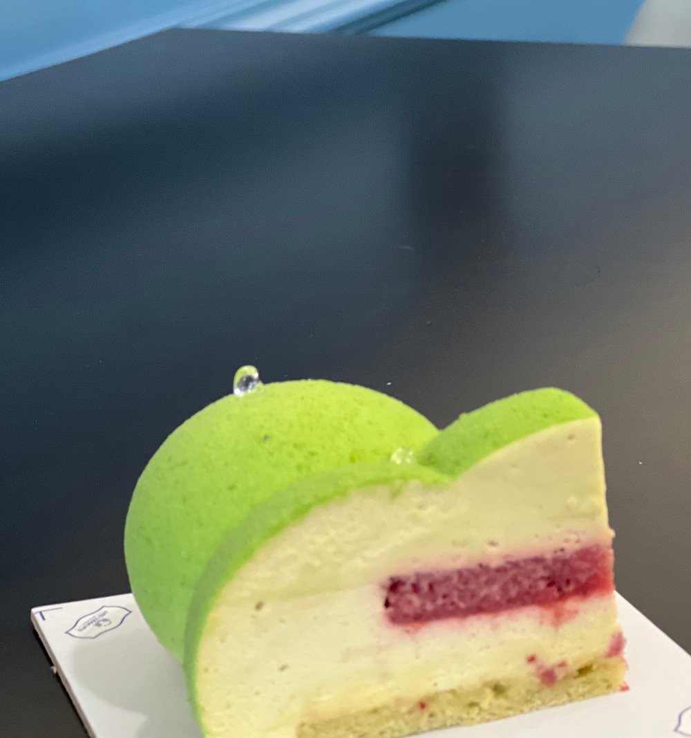 ნუშს ფქვილისა და ფსტის ბისკვიტი,თეთრი შოკოლადისა და ფსტის კრემი,მარწყვის კულით Almond flour and pistachio biscuit, white chocolate and pistachio cream, with strawberry jam