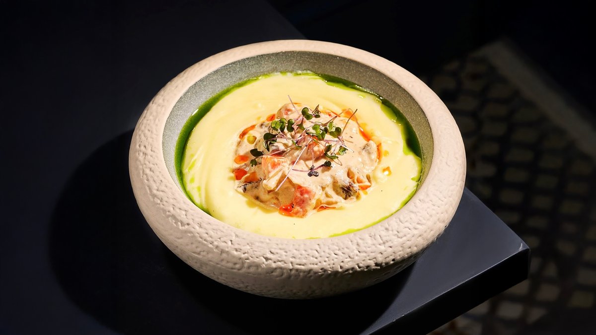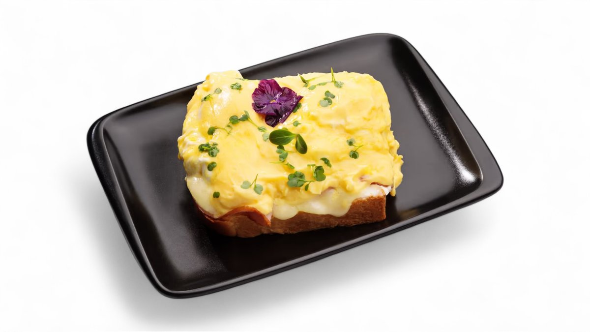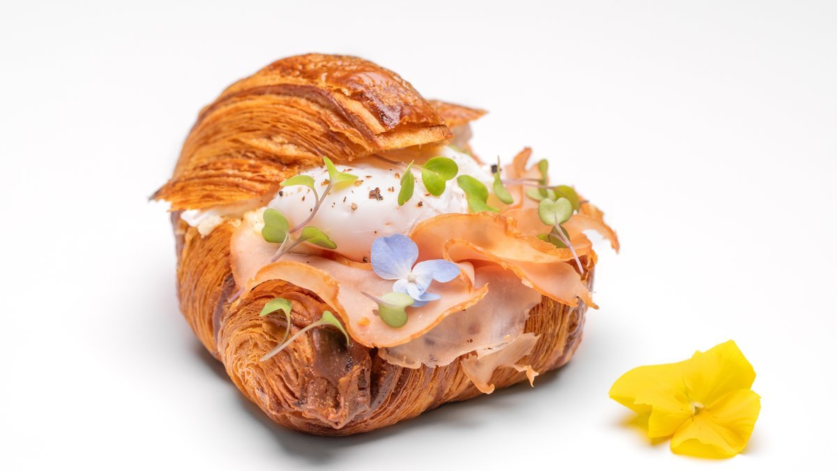 ბრიოში, ლორი, კრემ-ყველი, ემენთალი, ჰოლანდიური სოუსი Brioche, ham, cream cheese, Emmental, Hollandaise sauce