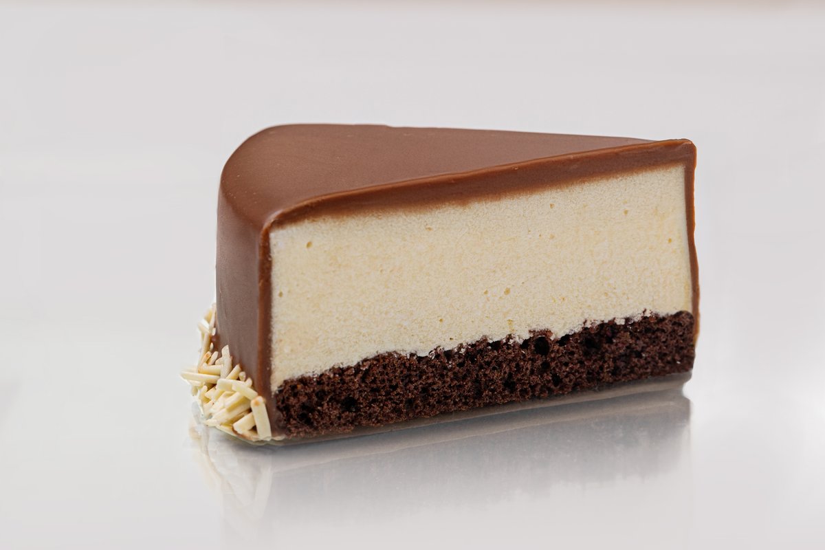 ორცხობილის ძირი,ვანილის ბისკვიტი,თეთრი შოკოლადის მუსი,ჟოლოს კული,ზევიდან ვრადისფერ ბელგიურ შოკოლადში ამოვლებული Biscuit base, vanilla biscuit, white chocolate mousse, raspberry coulis, covered in pink Belgian chocolate on top