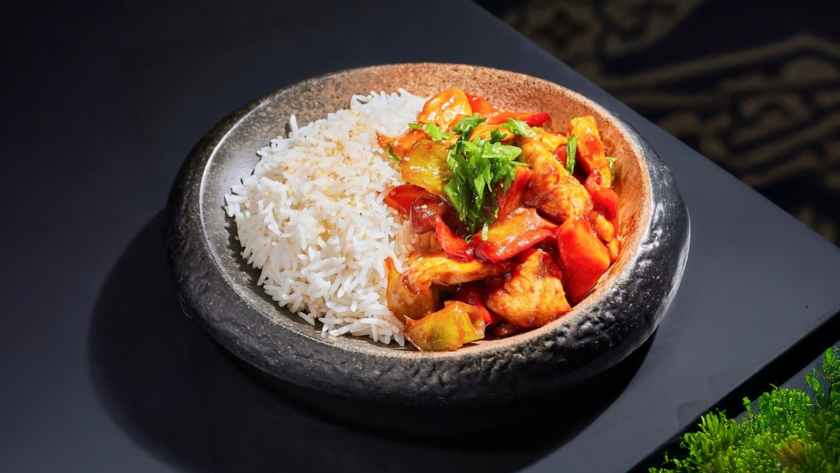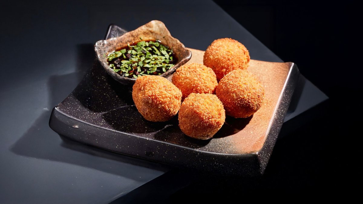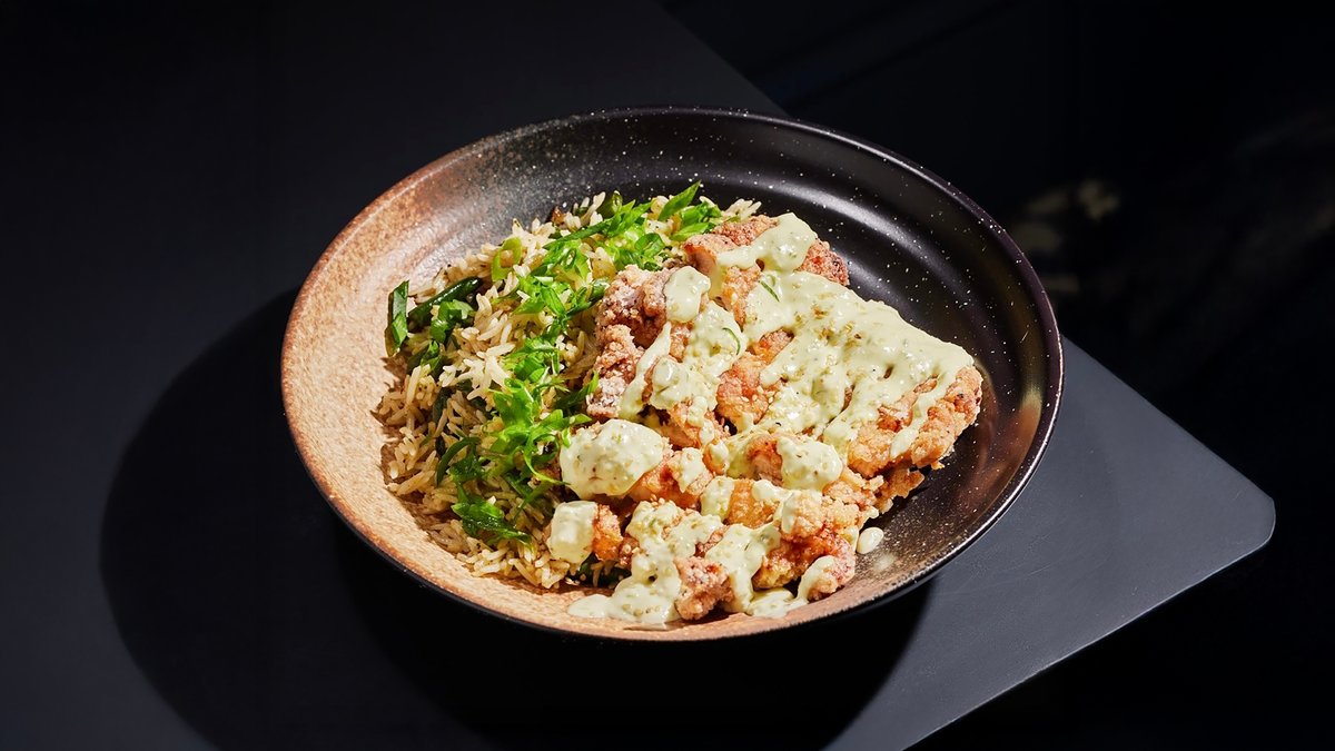 პანკოში შემწვარი ქათმის ბურთულები, ბრინჯი ბოსტნეულით, სოუსი Panko-crusted chicken balls,vegetable rice, sauce