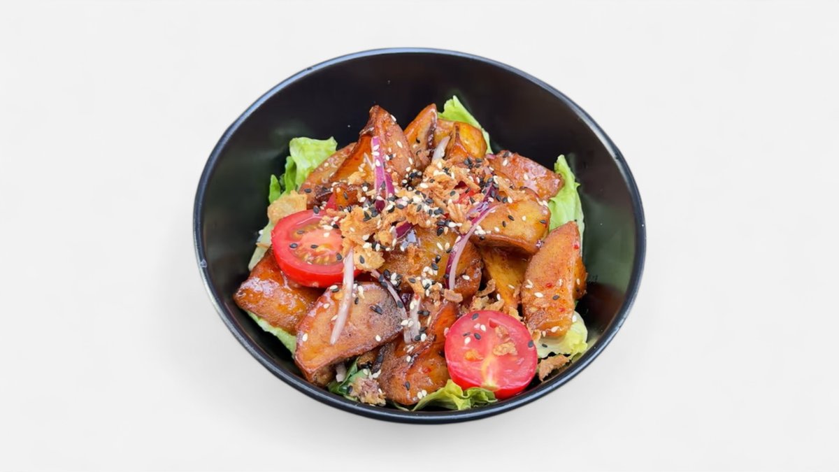 Chicken / salad leaves / cherry tomatoes / red onions / fried onions / sweet chili sauce / sesame