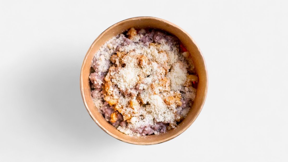 Champignons / onions / potatoes / cream / parmesan mousse / labne / croutons / droplets of red dry adjika for aroma