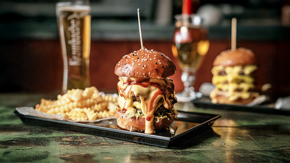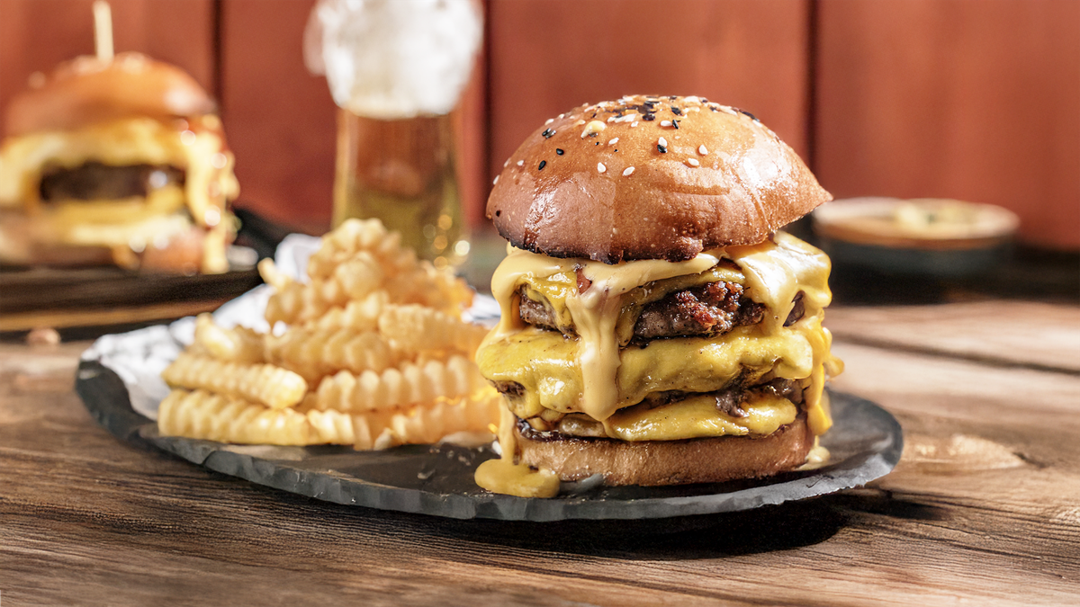 საქ ხორცი 100 გრ,სულგუნი ყველის კოტლეტი,ხალაპენიო,ცოცხალი კიტრი,სალათის ფოთოლი,პომიდორი,წითელი ხახვი,ბეკონი,ჩედარის ფირფიტა,მოცარელა,თაფლიანი მდოგვის სოუსი,ჟოლოს სოუსი,ყველის სოუსი,ჩვენთან დამზადებული ბულკი,კარტოფილი ფრი კეტჩუპის სოუსით.