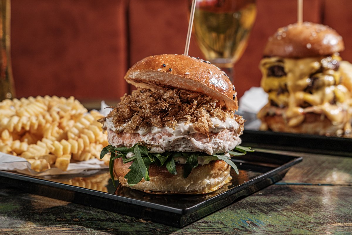 ნორვეგიული ორაგული,ბულკი,სპეც სოუსი,რუკოლა,კრემ ყველი,გარნირად კარტოფილი ფრი.