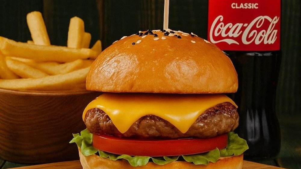 ბურგერის ბულკი, საქ ხორცი 100გრ, სალათის ფოთოლი, პომიდორი, სპეც სოუსი(კეტჩუპი, მაიონეზი, მდოგვი და მჟავე კიტრი), ჩედარის ფირფიტა, კარტოფილი ფრი + კოკა-კოლა.