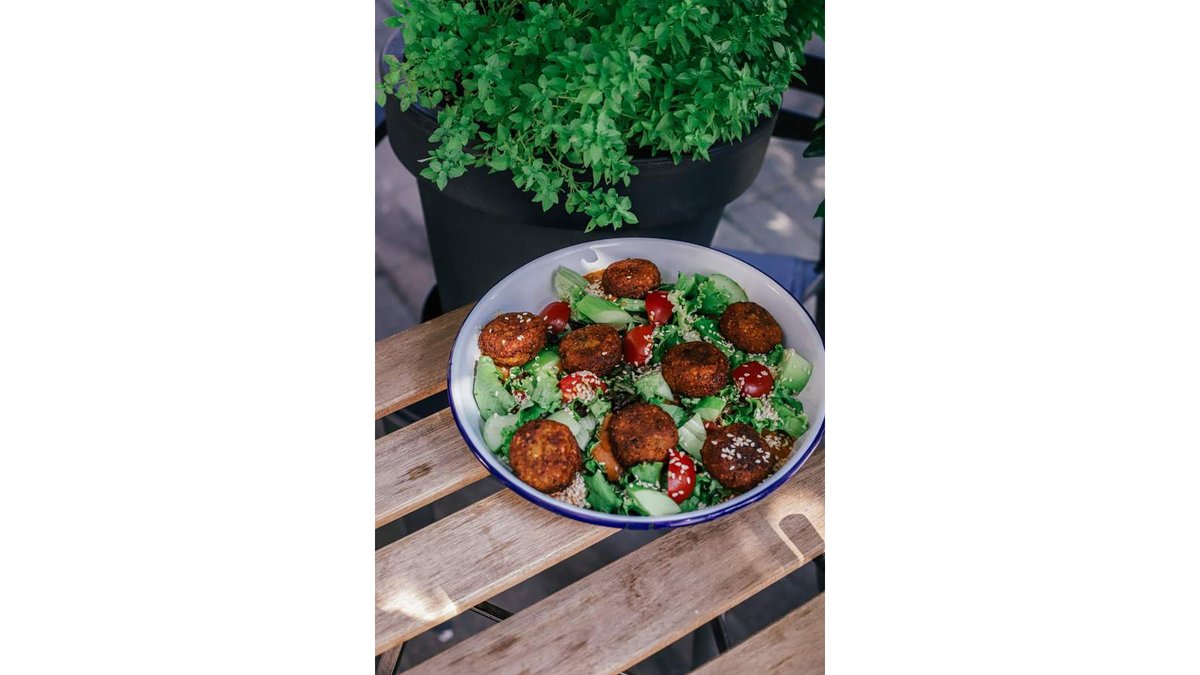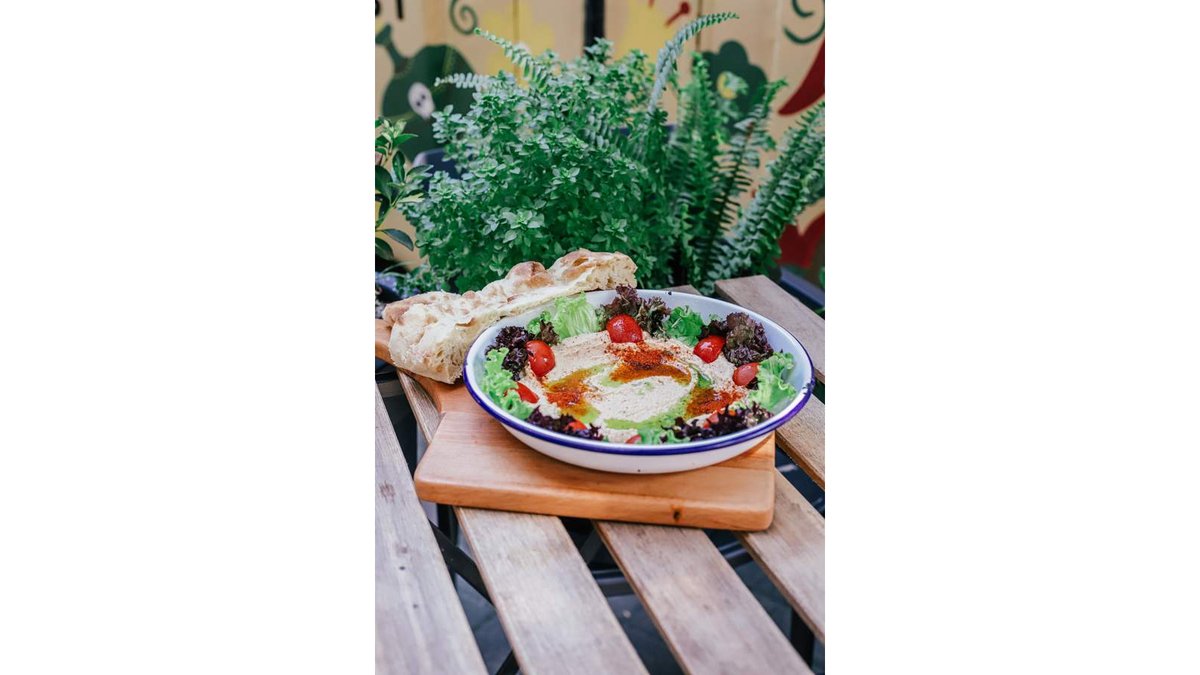 - hummus - falafel - salad mix - marinated sweet Bulgarian - pear - pomegranate sauce