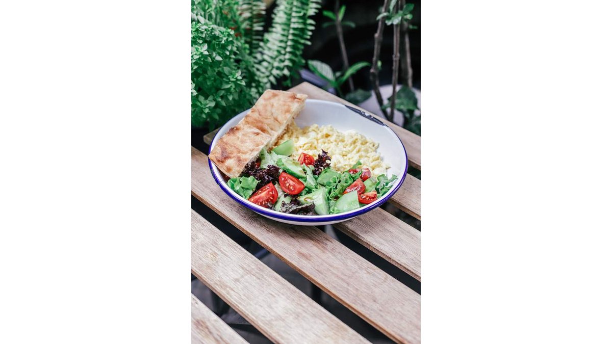 - Omelet - Salad mix - Cucumber - Tomato - Eggplant caviar - Bread