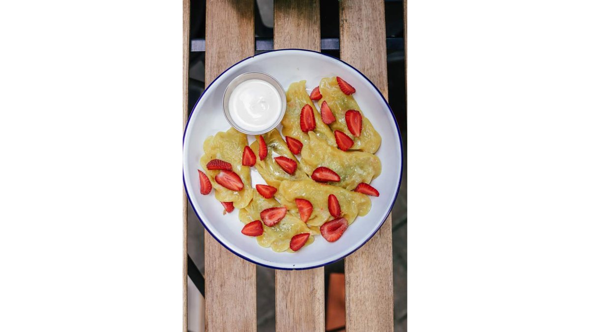 - sweet cottage cheese pieces - sour cream - fruit - jam - powdered sugar