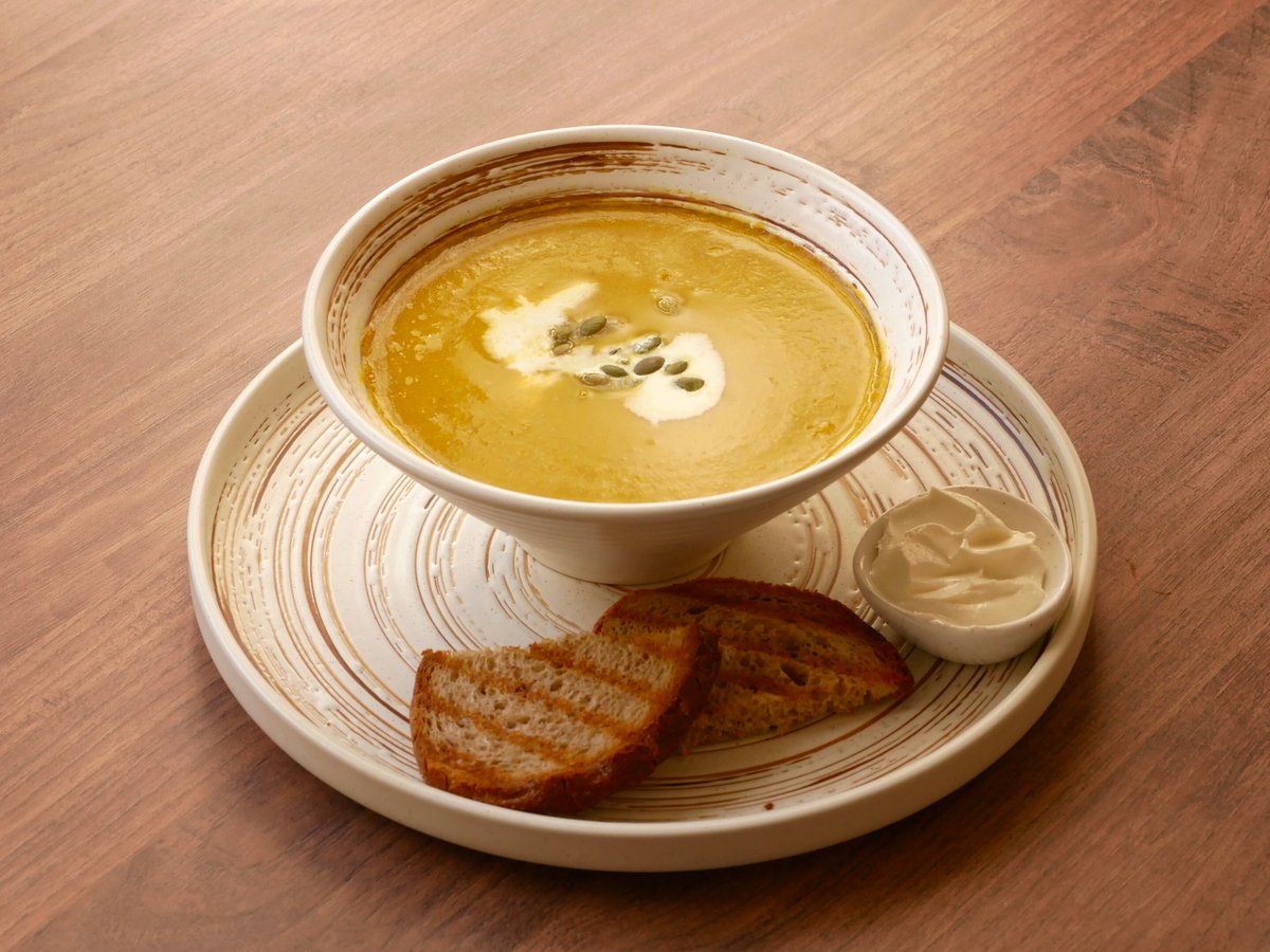 Water, pumpkin, lentils, salt. Served with cream cheese and croutons.