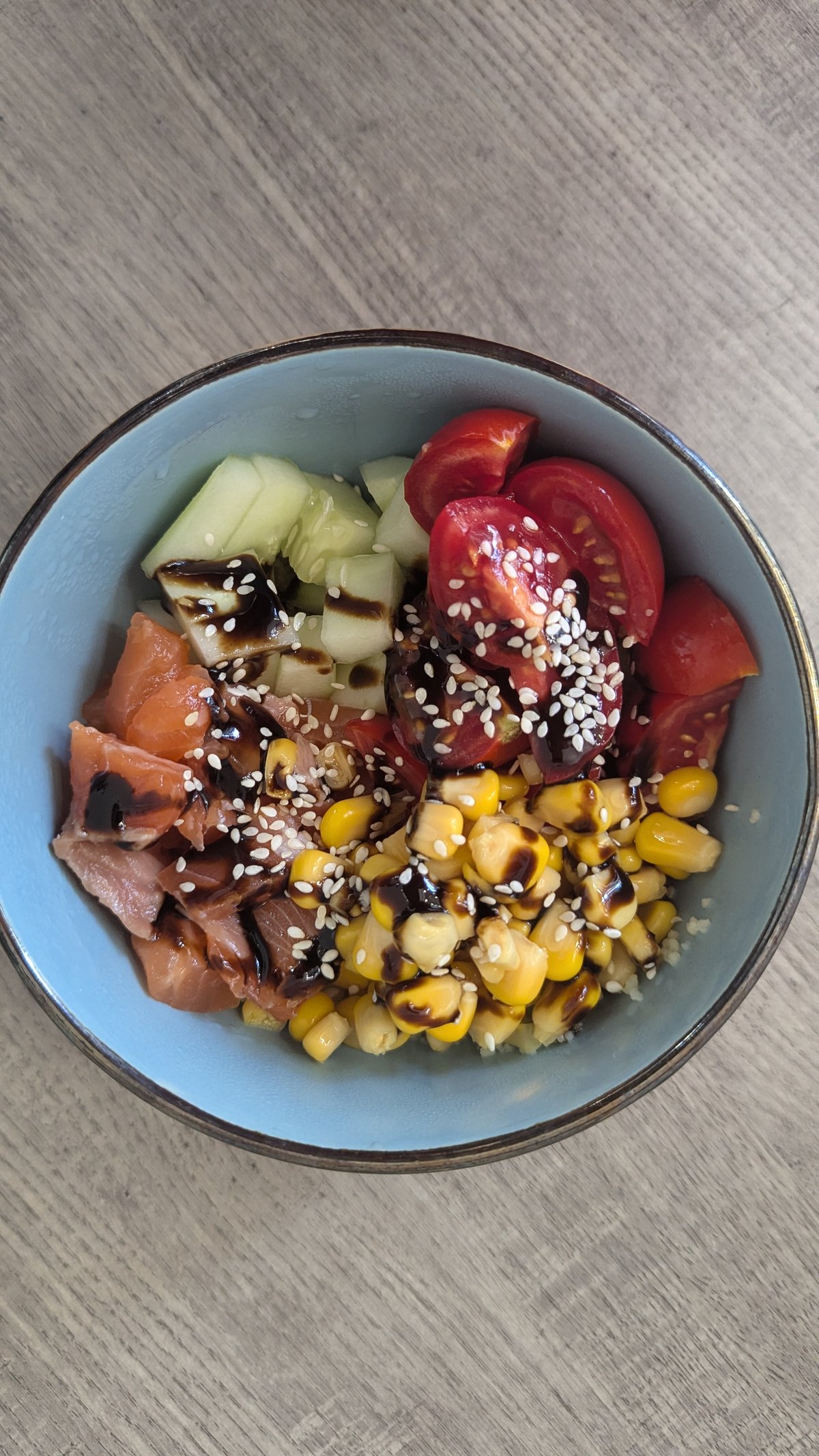 Боул с кус-кусом. Подаём с щедрой порцией слабосолёного лосося, свежим огурцом, черри, и кукурузой. Couscous bowl. Serve with a portion of lightly salted salmon, fresh cucumber, cherry tomatoes, and corn.