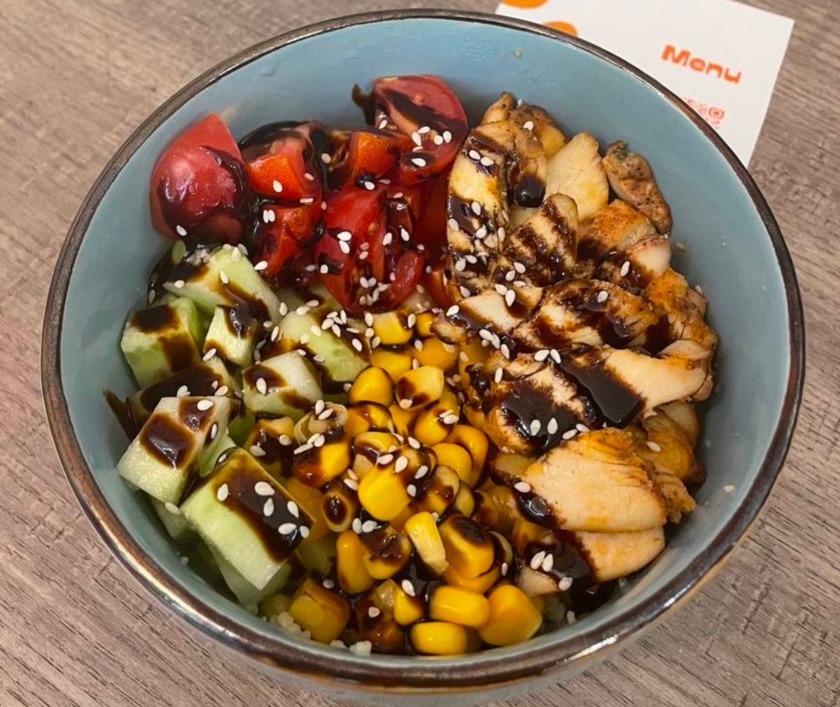 Couscous bowl. Serve with grilled chicken, fresh cucumber, cherry tomatoes, and corn Боул с кус-кусом. Подаём с обжаренной на гриле курочкой, свежим огурцом, черри, и кукурузой.