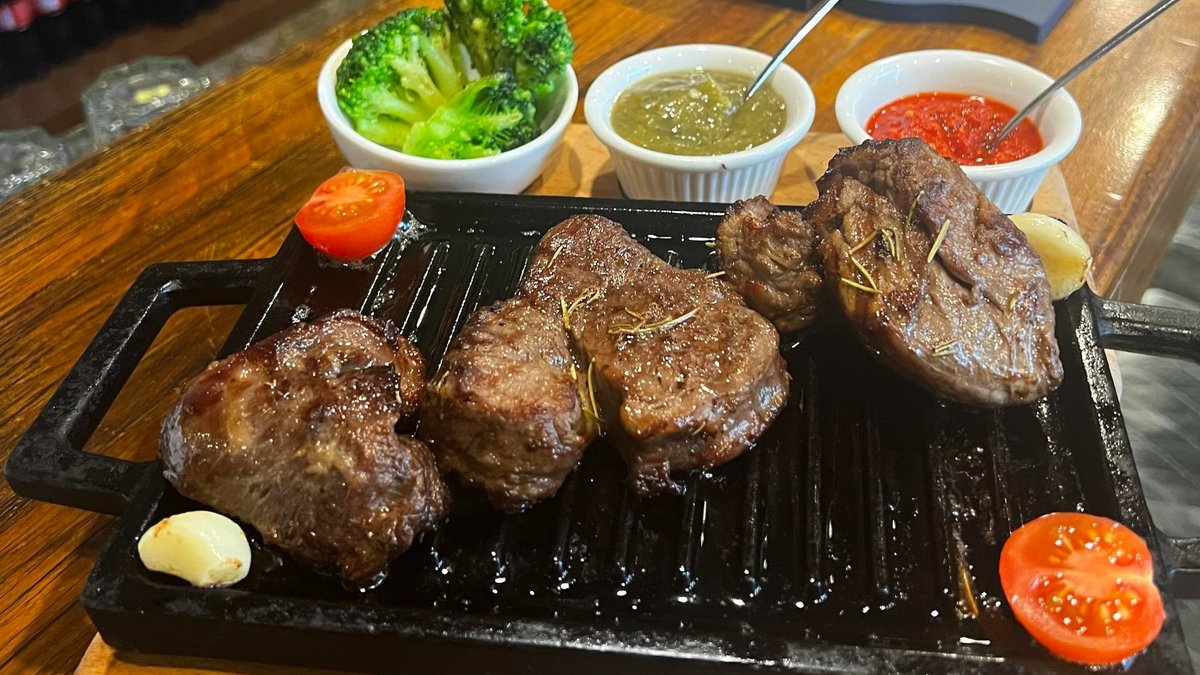 საქონლის ხორცის გამომცხვარი სტეიკი ბოსტნეულის გარნირით