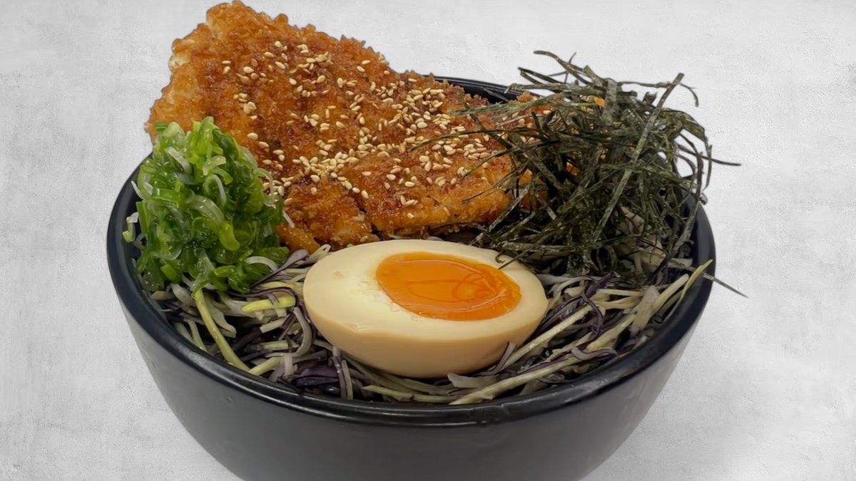 ორთქლზე მომზადებული ბრინჯი, შემწვარი ქათამი, დამარინადებული კვერცხი, ტერიაკის სოუსი, მწ. ხახვი
