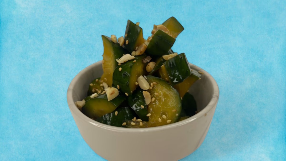 კიტრი , სეზამის მარცვლები, შეზავებული ბრინჯი