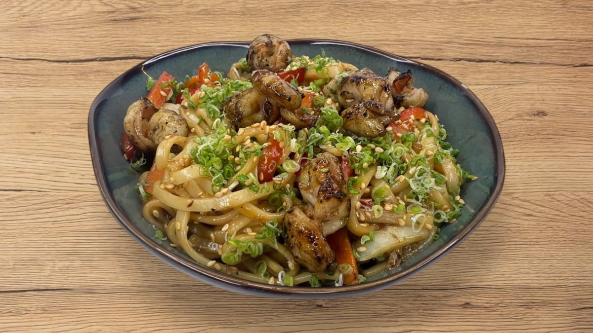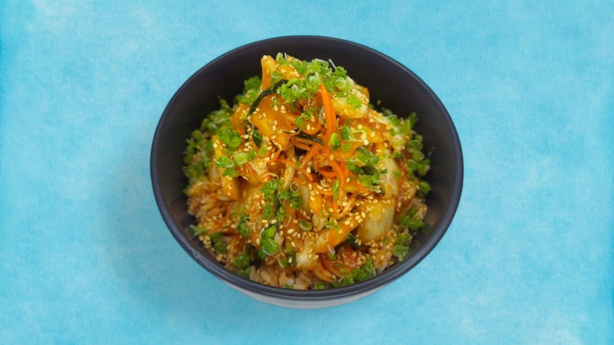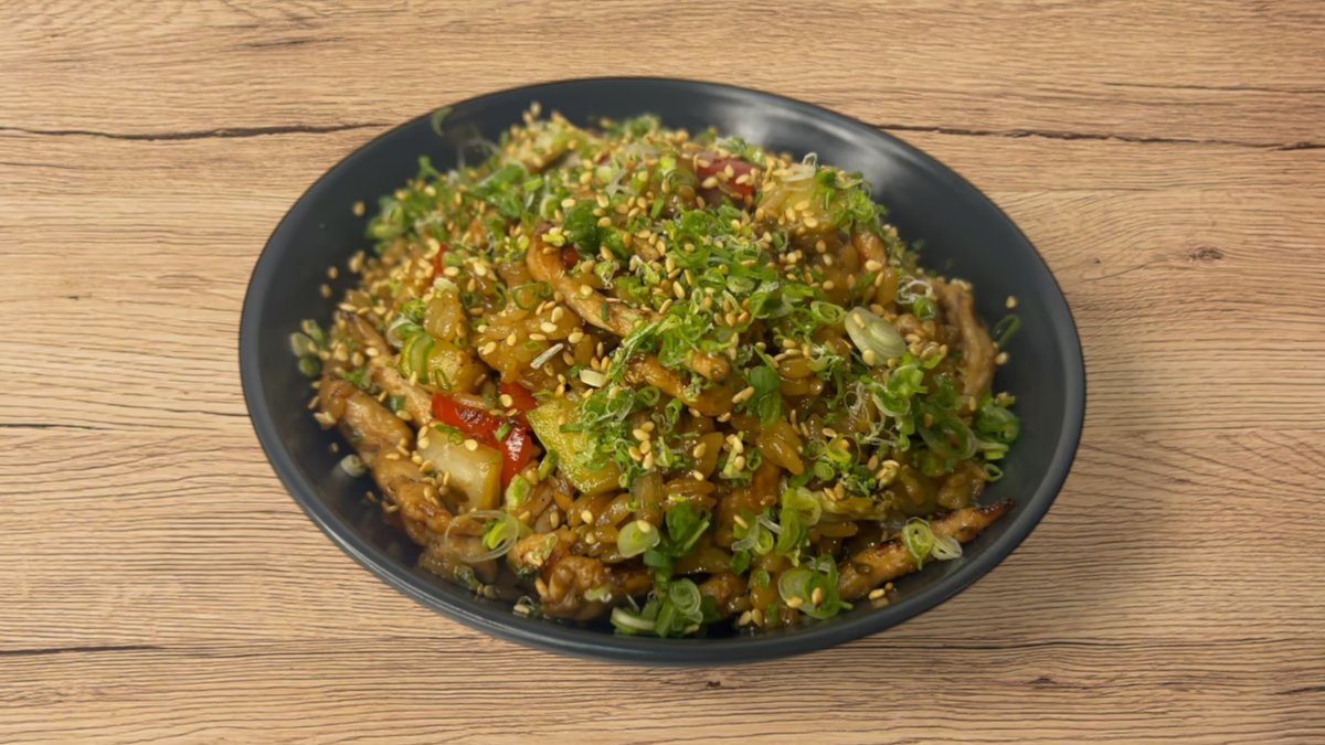 ორთქლზე მომზადებული ბრინჯი, დამარინადებული ქათამი, ბოსტნეული, ტერიაკის სოუსი, მწ. ხახვი, სეზამის მარცვლები