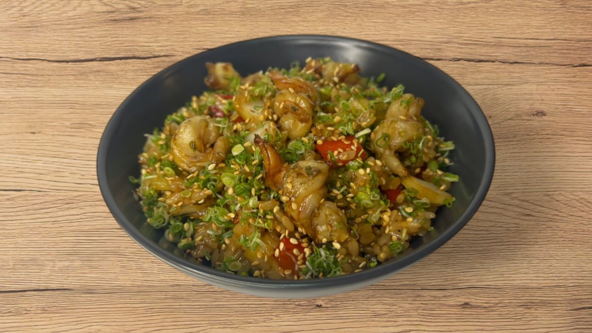 ორთქლზე მომზადებული ბრინჯი, კრევეტები, ბოსტნეული, ტერიაკის სოუსი, მწ. ხახვი, სეზამის მარცვლები