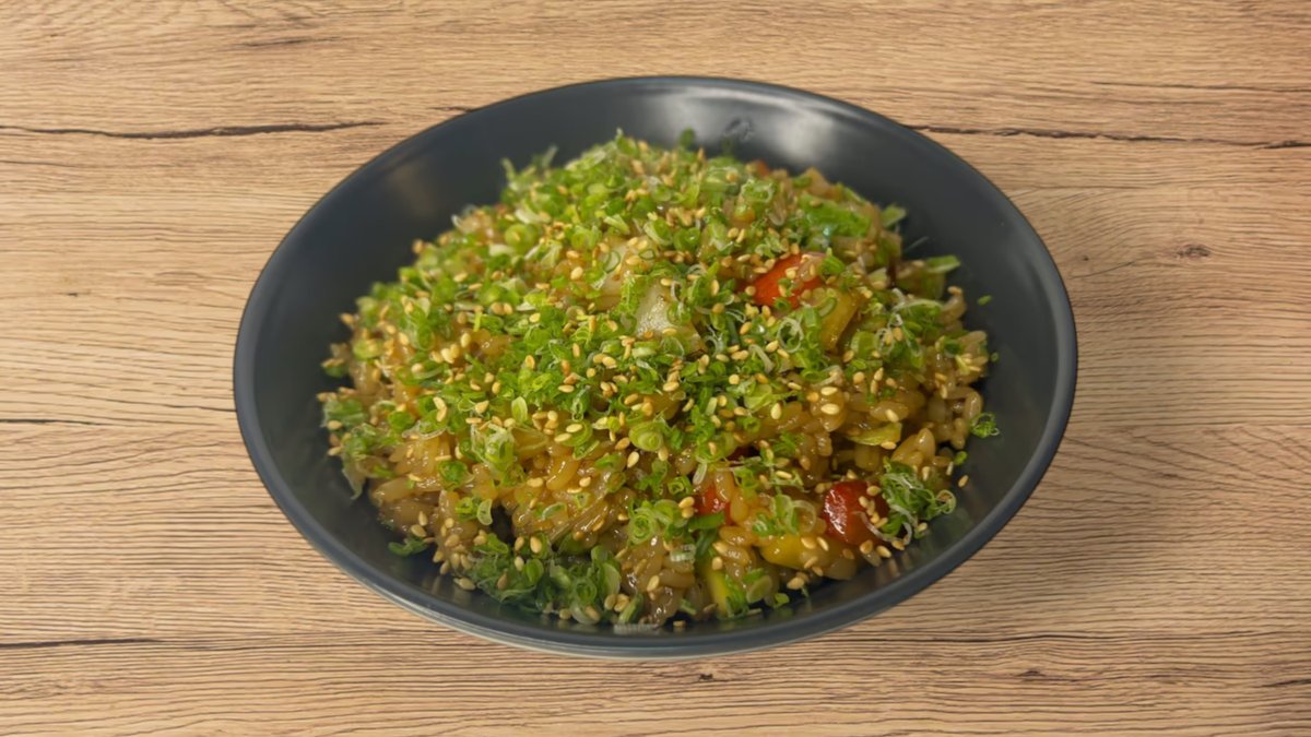 ორთქლზე მომზადებული ბრინჯი, ბოსტნეული, ტერიაკის სოუსი, მწ. ხახვი, სეზამის მარცვლები