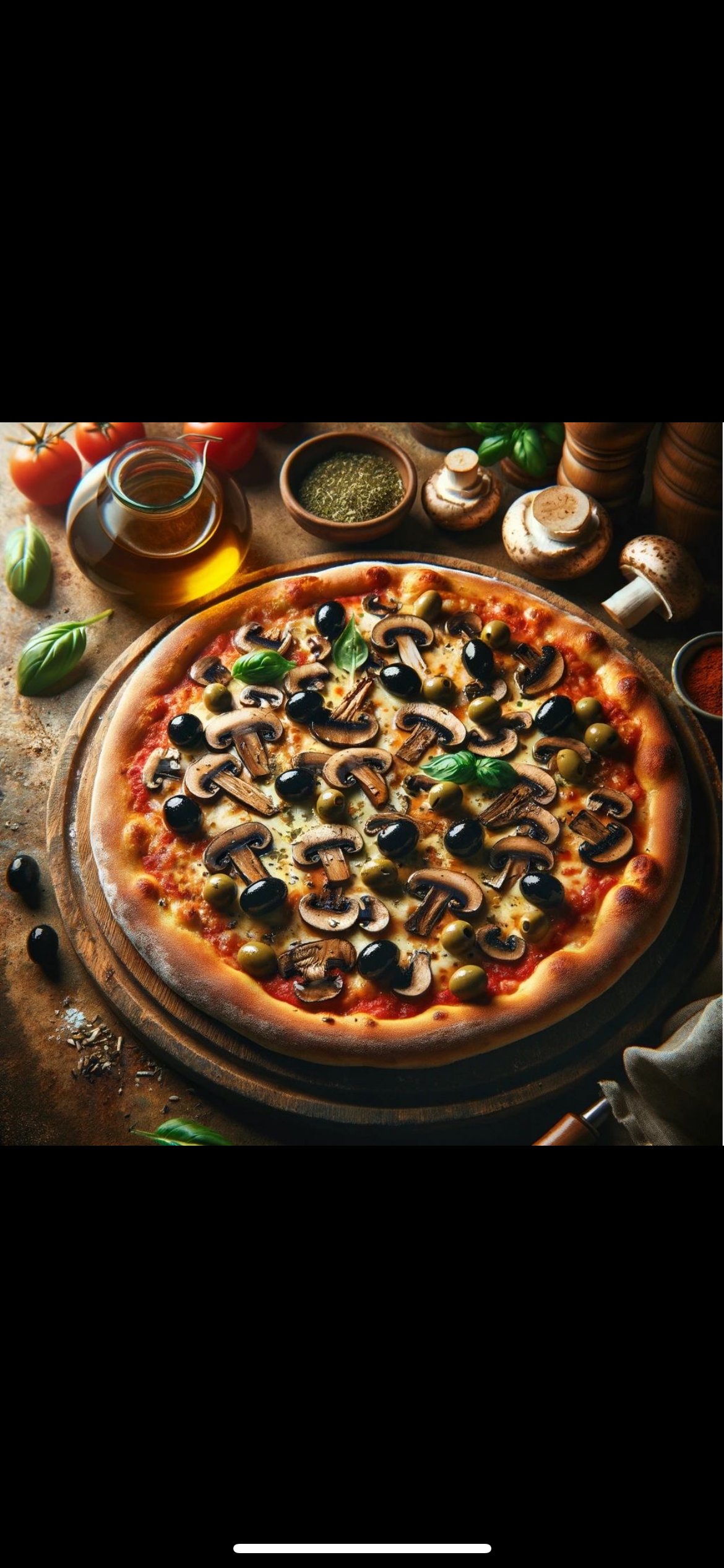 პიცის სოუსი, მოცარელა, სოკო, ზეთისხილი, ორეგანო