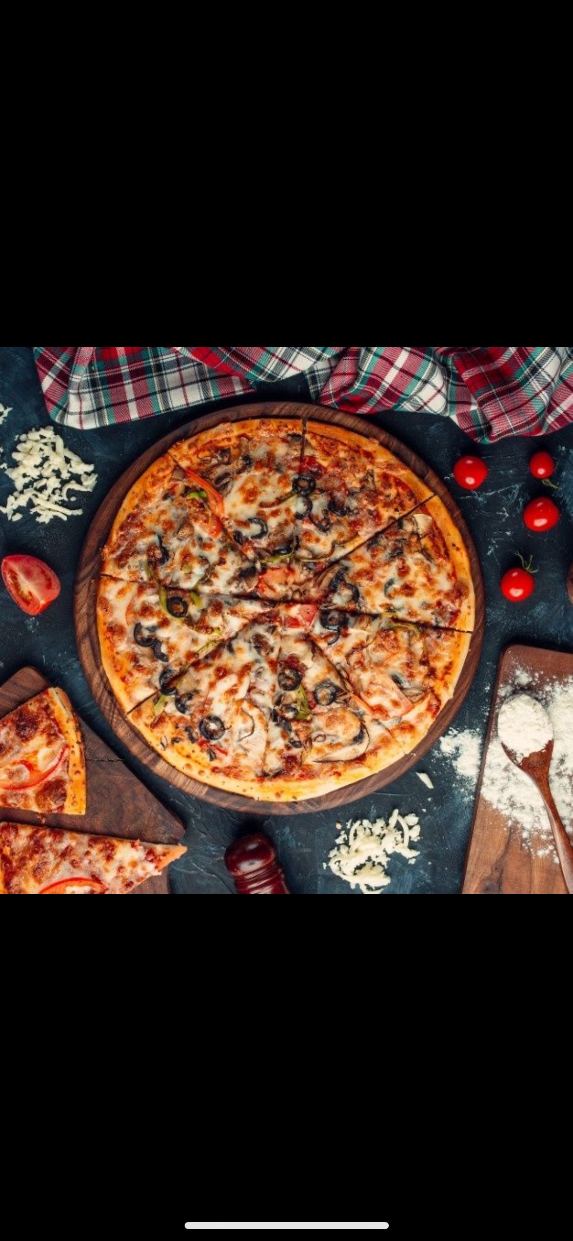 პიცის სოუსი, მოცარელა, ბულგარული წიწაკა, ხახვი, სოკო, ტკბილი სიმინდი,ორეგანო