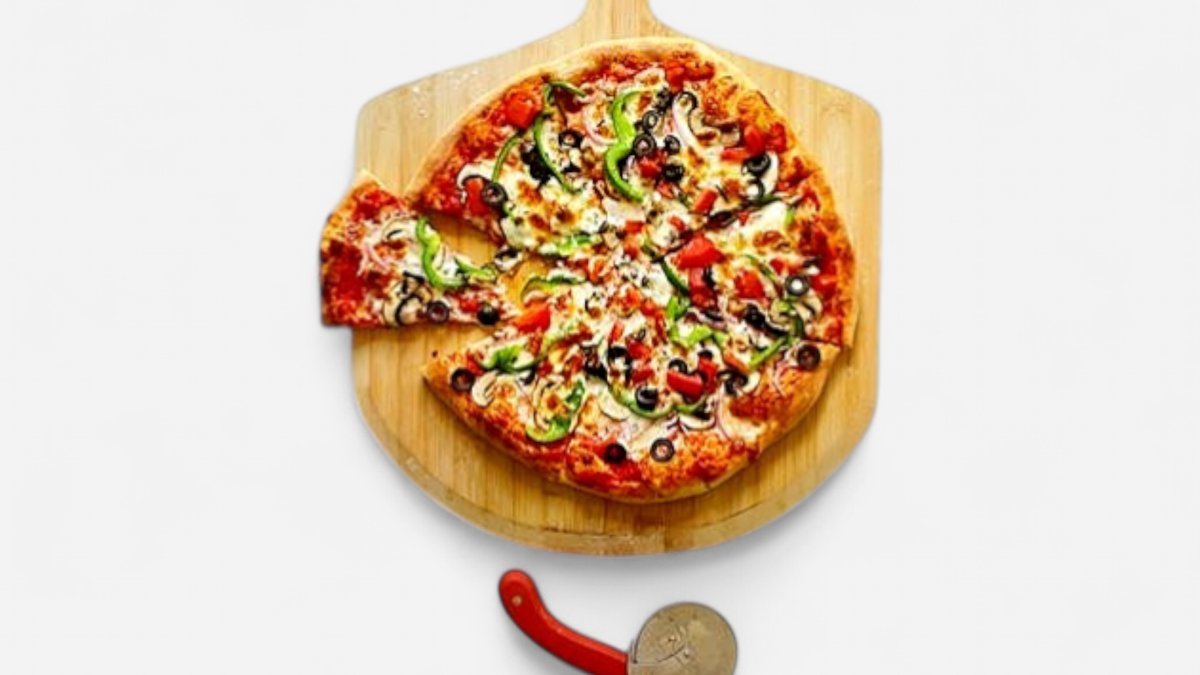პიცის სოუსი, მოცარელა, ლორი, ბულგარული წიწაკა,ზეთისხილი, სოკო, ორეგანო