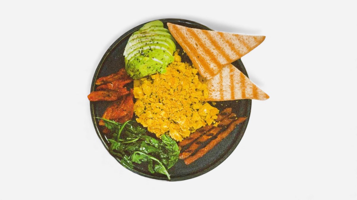 tofu, sun-dried tomatoes, spinach, avocado, vegan sausages, bread, sauce, spices