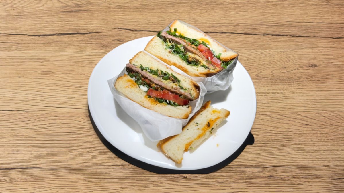 Beef, hokkaido bread, tomato, greens, cheese, mayonnaise, homemade chimichurri, crispy onion