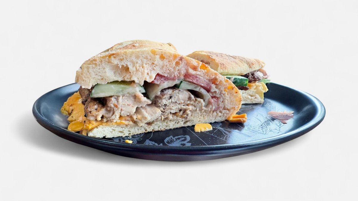 ჩაბატას პური. საფირმო სოუსი. ქათმის ფილე. პომიდორი. აისბერგი. კიტრი