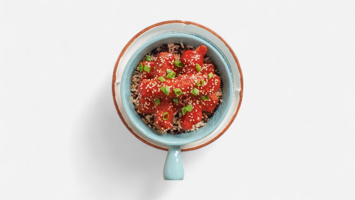 ქათმის ფილე,წითელი ბრინჯი,მწვანე ხახვი,სრირაჩა,სოიოს სოუსი,თეთრი სეზამი