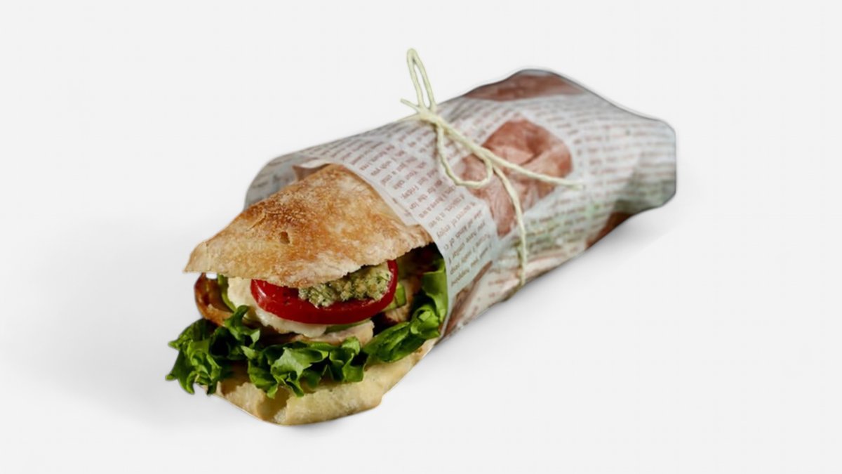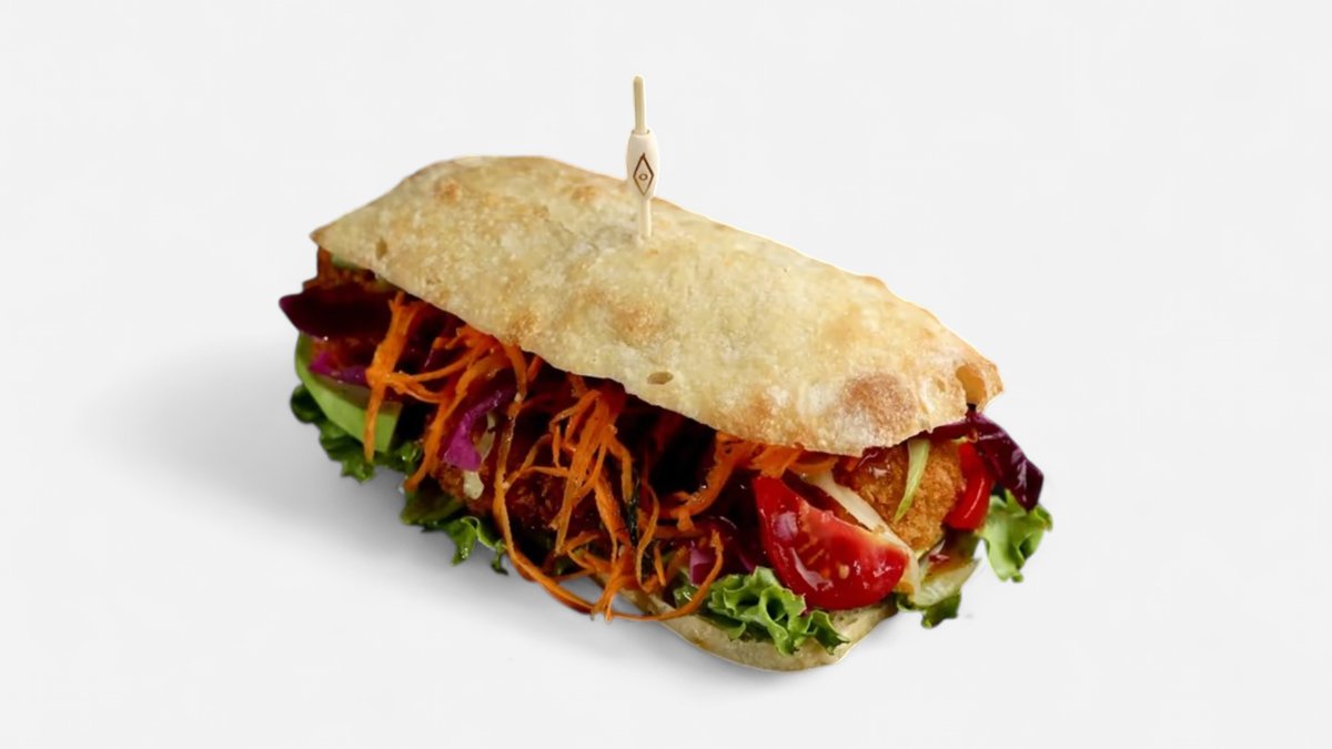 ქათმის ფილე,სალათის ფოთოლი,პომიდორი,ავოკადო,კიტრი,ხახვი,მოცარელა,მოხალული თხილისა და მწვანილების სოუსი,პური ჩაბატა
