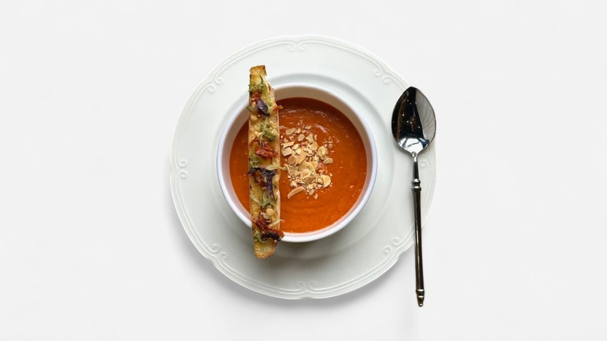 წითელი ბულგარული,სტაფილო,კარტოფილი,ხახვი,ნიორი,სოიოს სოუსი,ზეითუნის ზეთი,ჩაბატა