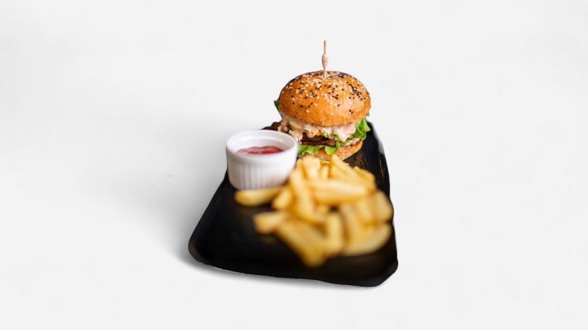 საქონლის ხორცი,ბურგერის პური,ჩედარი,პომიდორი,მჟავე კიტრი,დიჟონის მდოგვი,ვორჩესტერის სოუსი,სალათის ფოთოლი,ფრი