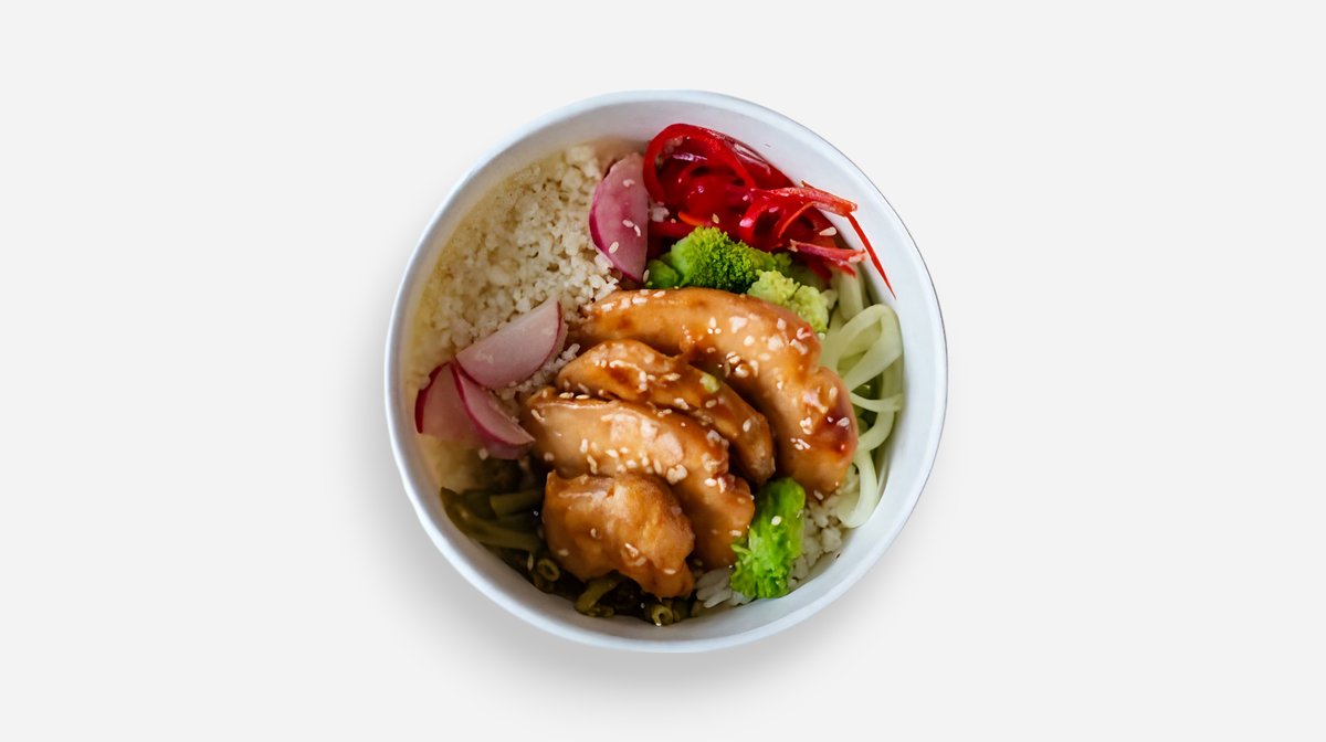 თეთრი ბრინჯი, კუსკუსი, კიტრი, ბულგარული, ბროკოლი, მწვანე ლობიო, ქათმის ფილე, სეზამი, ჩილის სოუსი
