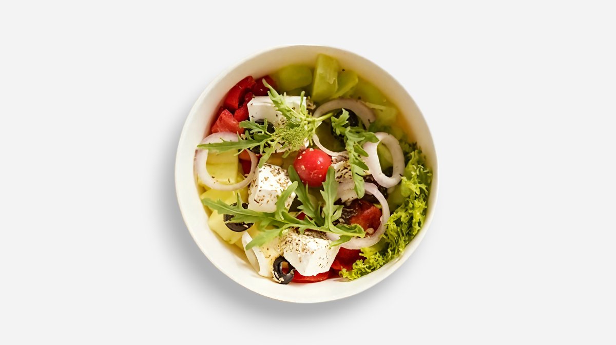 წითელი ბულგარული, მწვანე ბულგარული, კიტრი, ჩერი პომიდორი, სალათის ფურცელი, წითელი ხახვი, ზეთისხილი, ფეტა, ლიმონი, ზეითუნის ზეთი, ორეგანო