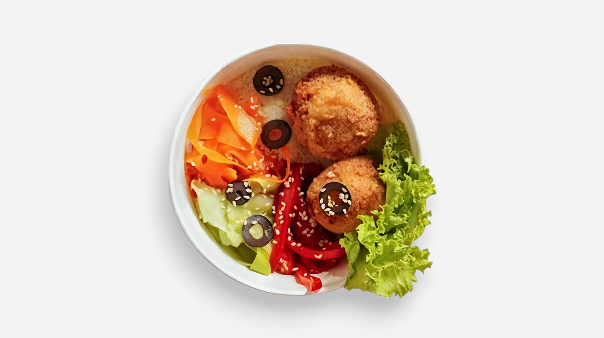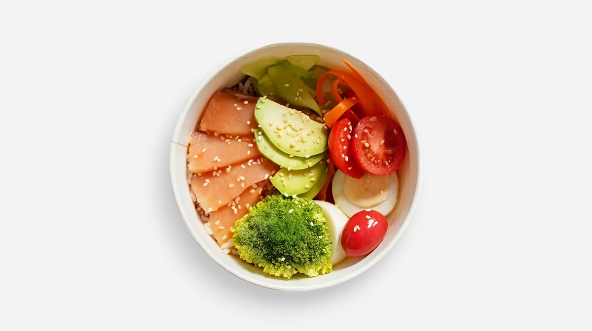 წითელი ბრინჯი, კიტრი, სტაფილო, ჩერი პომიდორი, ბროკოლი, ავოკადო, ზეთისხილი, ორაგული, მოხარშული კვერცხი, სოიოს სოუსი